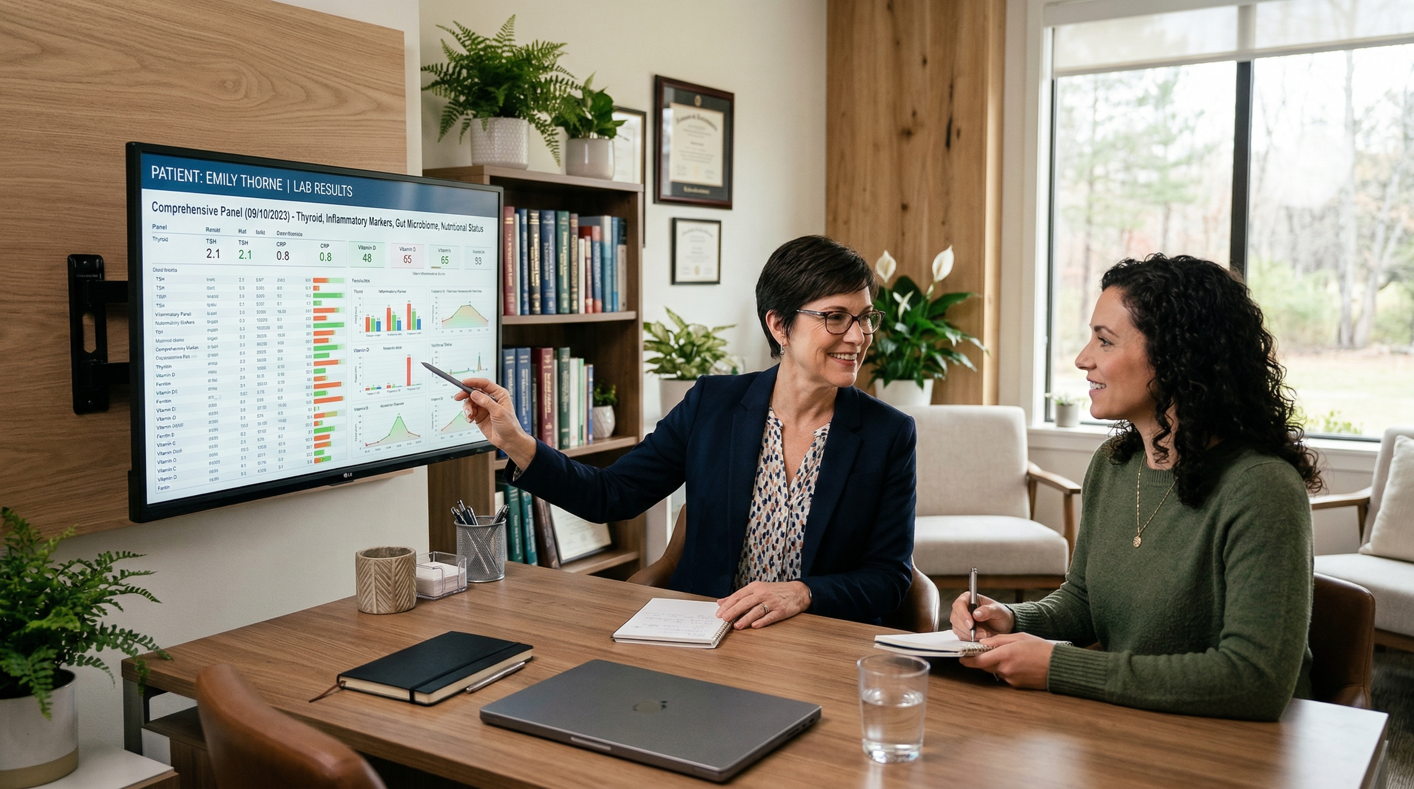 Your first visit is a comprehensive 60 to 90 minute evaluation. We review your complete health timeline, medications, supplements, diet, sleep, stress, environmental exposures, and family history. This detailed intake guides which lab panels to order and forms the foundation of your personalized treatment protocol.